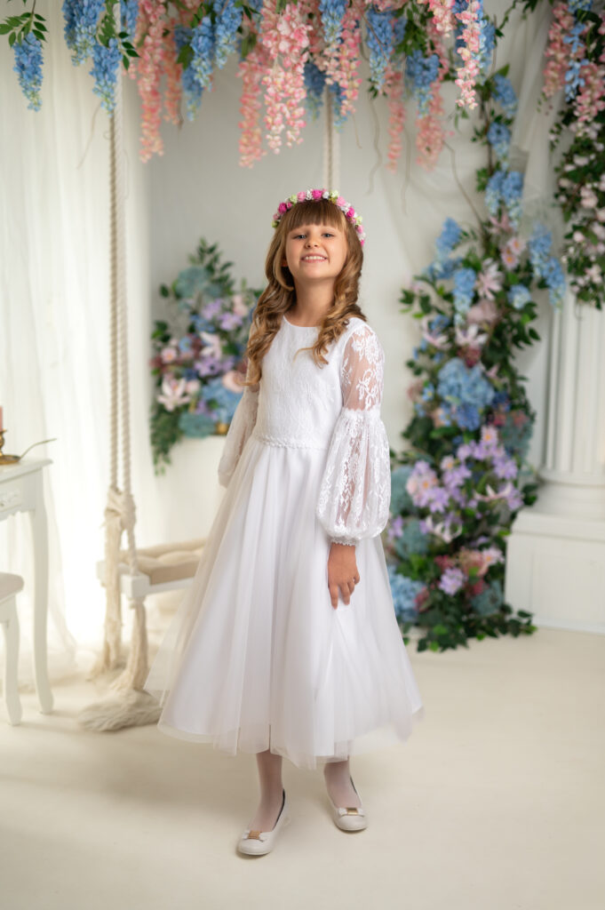 Dessi to kwintesencja francuskiej koronki misternie ułożonej na gorsecie wraz z przepięknym marszczonym długim rękawem całość zdobi delikatna koronkowa taśma w pasie, która oddziela gorset od delikatnej spódnicy uszytej z bardzo delikatnego królewskiego tiulu