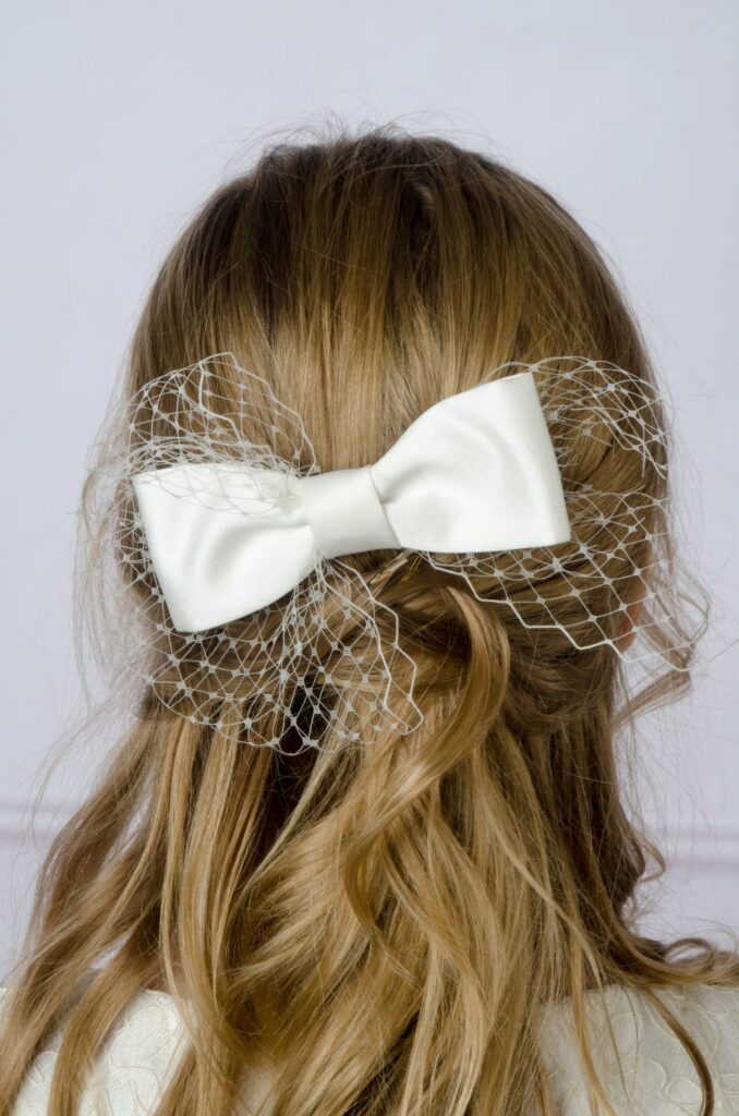 Subtelna kokarda do włosów doskonale sprawdzi się zarówno pod kokiem jak i nad nim, a także przy włosach delikatnie upiętych. Jest świetnym akcentem dopełniającym fryzurę jak i całą stylizację komunijną. Wsuwana za pomocą grzebyczka, pozwoli na łatwą aplikację na głowie dziewczynki. Dodatkowo kokarda posiada ozdobną woalkę, która dodaje jej elegancji i szyku. Idealnie wpasuje się do szykownych i ozdobnych sukieneczek nadając im spokojnego akcentu lub też do skromnej i delikatnej stylizacji. Kokarda jest ręcznie wykonana, co decyduje o jej wyjątkowości i niepowtarzalności.
