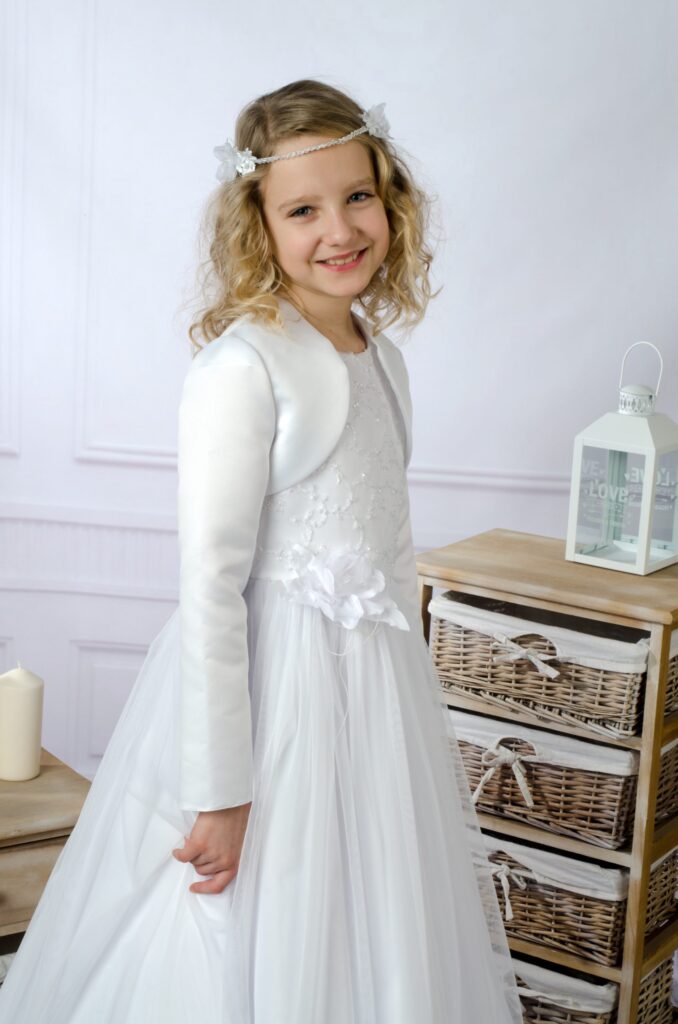 Eleganckie i klasyczne bolerko komunijne z świetniej jakości atłasu ślubnego, dzięki swojemu uniwersalnemu stylowi świetnie pasuje do każdej sukieneczki komunijnej. Długi rękawek idealnie sprawdzi się na chłodniejsze dni, zwłaszcza do sukienek z krótkim rękawkiem. Bolerko jest krótkie, co sprawia, że nie przykrywa sukieneczki. Z pewnością przyda się zarówno na ceremonii Komunii Świętej jak i na biały tydzień. Bolerko świetnie się układa zarówno na sukienkach komunijnych jak i na albach.